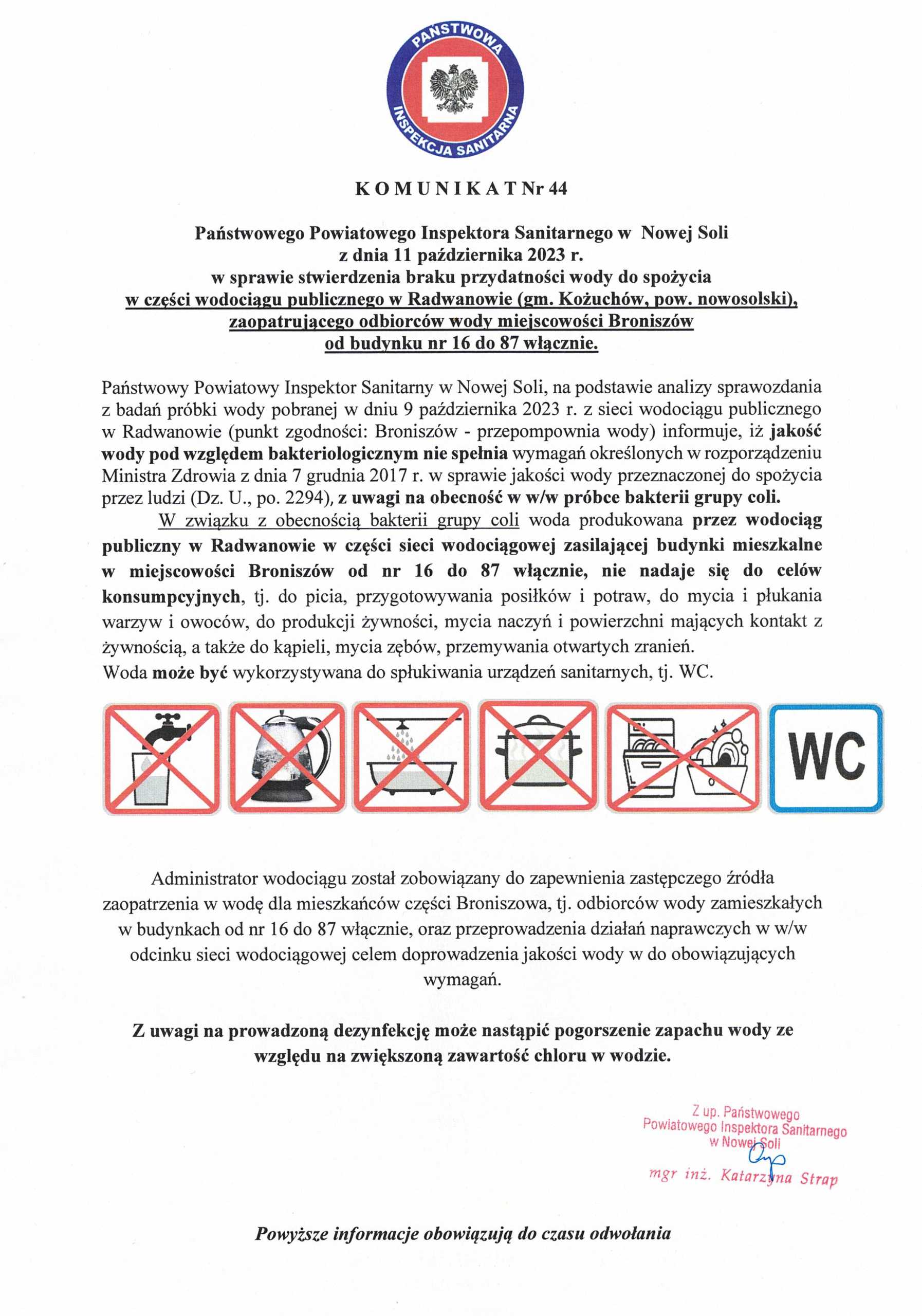 Przedsiębiorstwo Usług Komunalnych USKOM Sp. z o.o. informuje, że w związku z obecnością bakterii grupy coli woda produkowana przez wodociąg publiczny w Radwanowie w części sieci wodociągowej zasilającej część Broniszowa, tj. odbiorców wody zamieszkałych w budynkach od nr 16 do 87 włącznie, nie nadaje się do celów konsumpcyjnych,