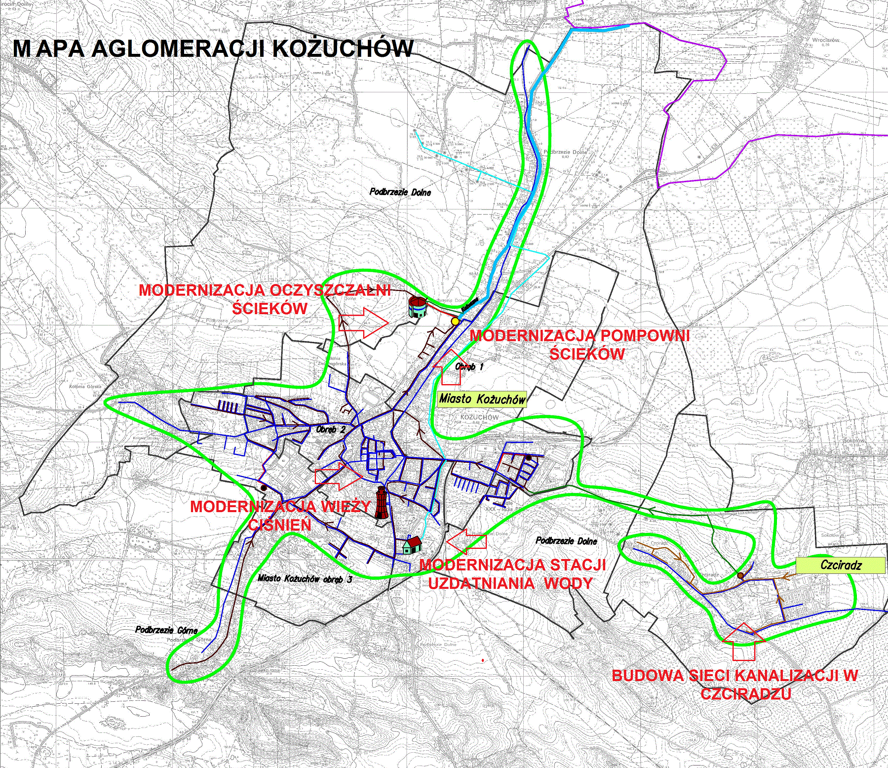 - Budowę sieci kanalizacji sanitarnej w miejscowości Czciradz z odprowadzeniem ścieków do oczyszczalni w Podbrzeziu Dolnym ( w zakresie zwiększenia stopnia skanalizowania aglomeracji Kożuchów),