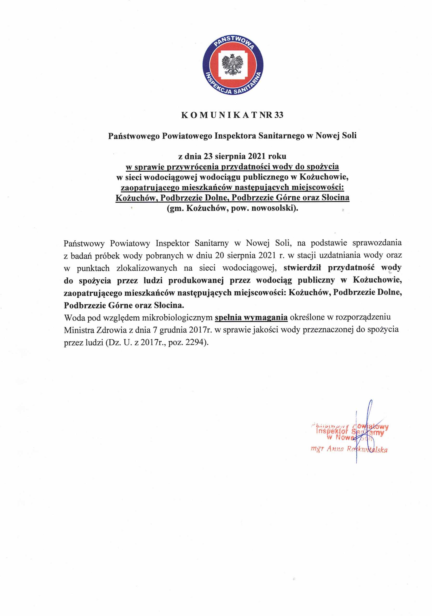 Przedsiębiorstwo Usług Komunalnych USKOM sp. z o.o. informuje, że dnia 23.08.2021 r. Państwowy Powiatowy Inspektor Sanitarny w Nowej Soli stwierdził przydatność wody do spożycia przez ludzi produkowanej przez wodociąg publiczny w Kożuchowie, zaopatrującego mieszkańców następujących miejscowości: Kożuchów, Podbrzezie Dolne, Podbrzezie Górne oraz Słocina.